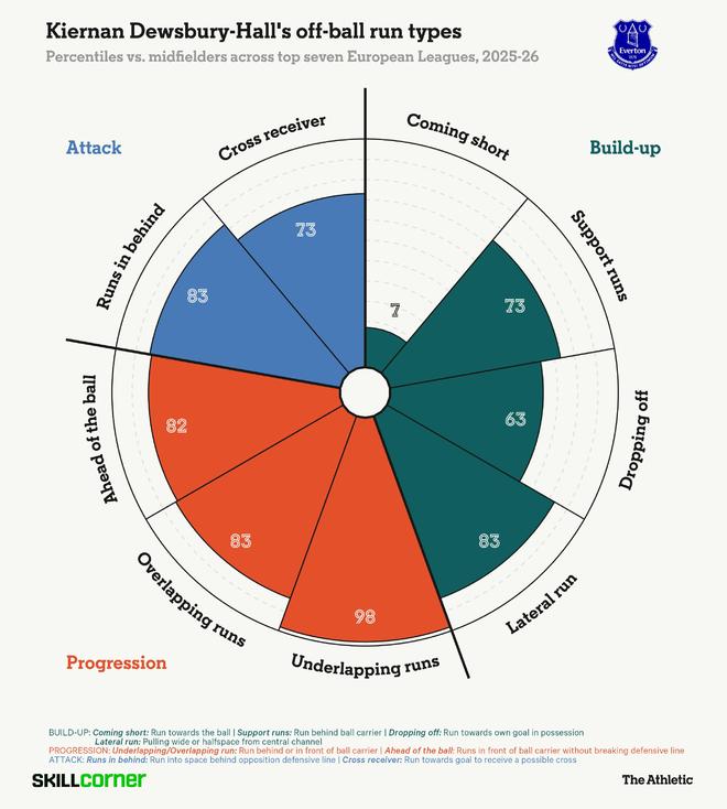 下图使用SkillCorner数据,展示了迪尤斯伯里-霍尔的无球跑动。